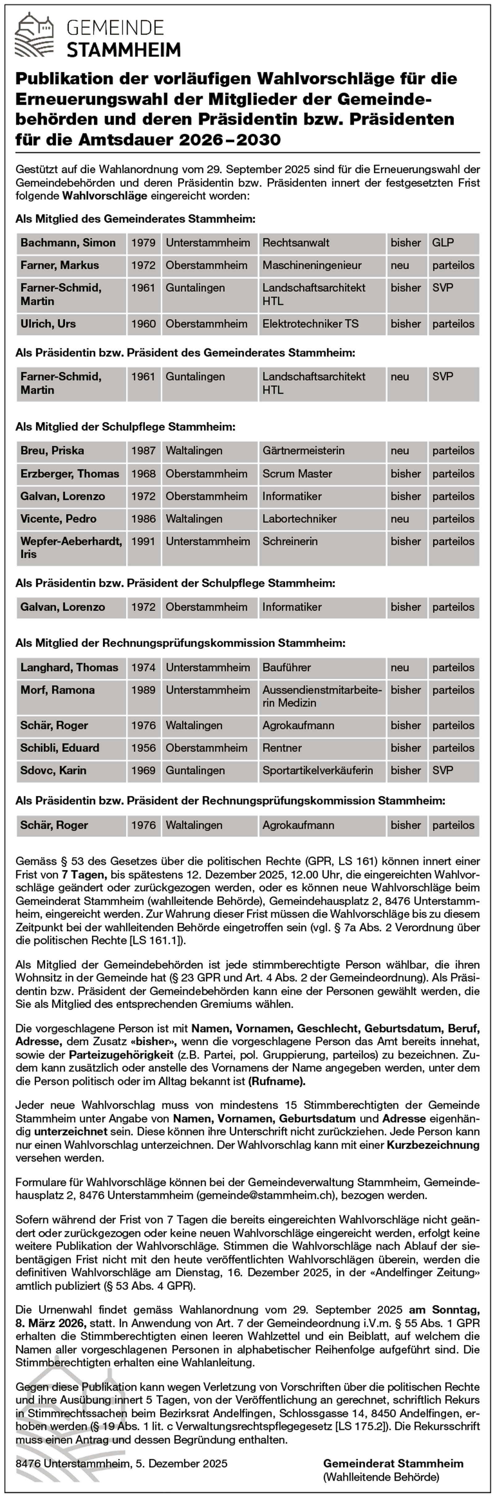 Publikation der vorläufigen Wahlvorschläge