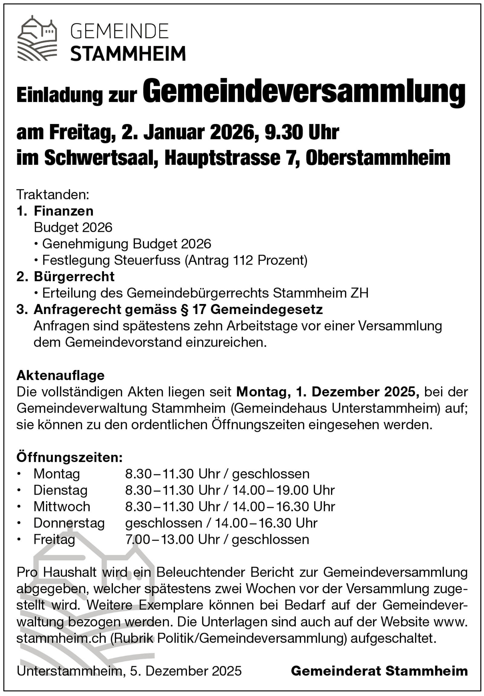 Einladung zur Gemeindeversammlung