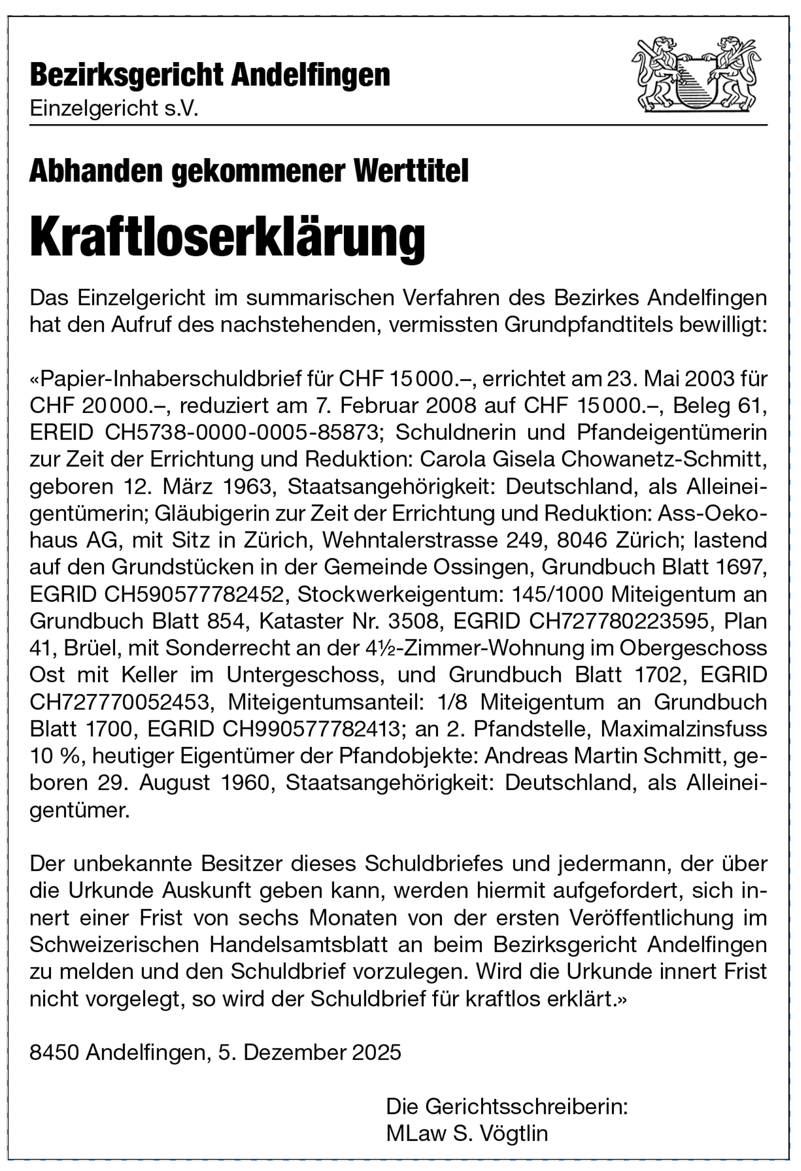 Erneuerungswahl des Bezirksgerichts Andelfingen