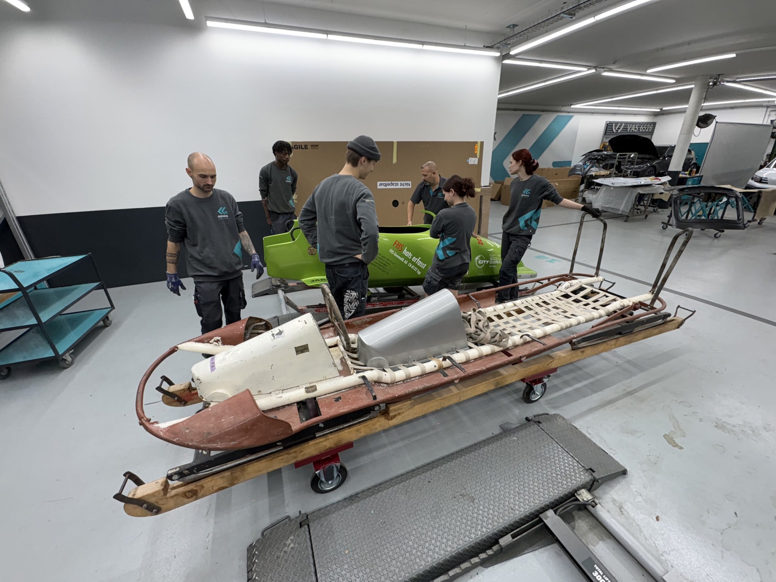 Die Aufgaben sind vielfältig. Zunächst wurden die Bobs in ihre Einzelteile zerlegt, danach galt es, diverse Teile zu richten oder neu zu verschweisÂsen. Das Team fertigte neue Haltegriffe und AnschiebebĂĽgel an, schärfte die Kufen, spachtelte und fĂĽllerte. Den Abschluss bilden die Lackierung und der Zusammenbau. Während der alte Viererbob (abgesehen von der Sitzfläche) fast ausschliesslich aus Metall besteht, kommt beim modernen Zweierbob eine weitere Komponente hinzu. Er verfĂĽgt ĂĽber eine HĂĽlle aus Kunststoff.